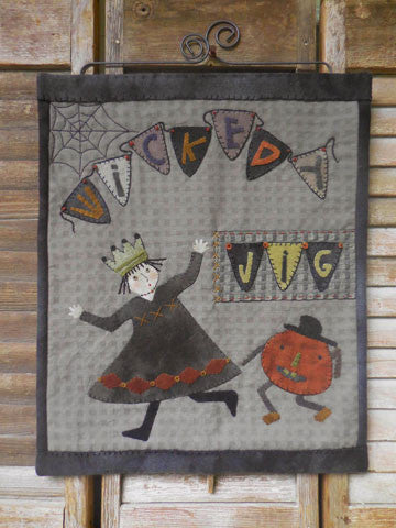 RR180 PATTERN: Wool applique on cotton wall hanging. Whimsical but not too spooky! Jiggity Jack and the little witch that thinks she's a queen. Simple appliqué using Steam-A-Seam Lite fusible webbing. Shown hanging from a 12" Ackfeld Wire Double Scroll w/Dowel Hanger. Measures Approximately 18" x 21".