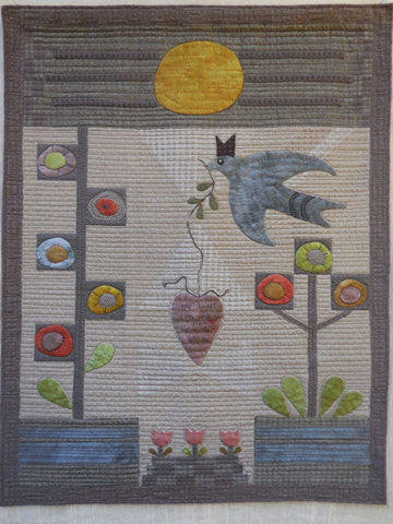 #RR-184 This is a 40" x 54" quilt. Shown in woven cottons and hand dyed osnaburgs but any fabric may be used. This is mostly pieced with some simple appliqué. Easy starch method instructions for the appliqué pieces.